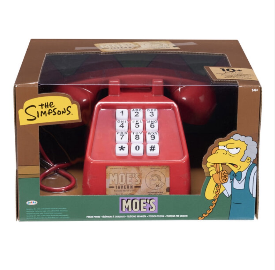 El Teléfono de Bromas de Moe de Los Simpson captura el aspecto del icónico teléfono visto en la Taberna de Moe. Incluye bromas telefónicas y frases de varios personajes de la serie de animación. Coge el auricular del teléfono y marca 7 dígitos cualquiera para escuchar las divertidas llamadas de broma que se han hecho a la Taberna de Moe a lo largo de los años. Cambia de modo para que el teléfono te llame aleatoriamente con las llamadas de broma. Requiere 3 pilas AAA (incluidas).